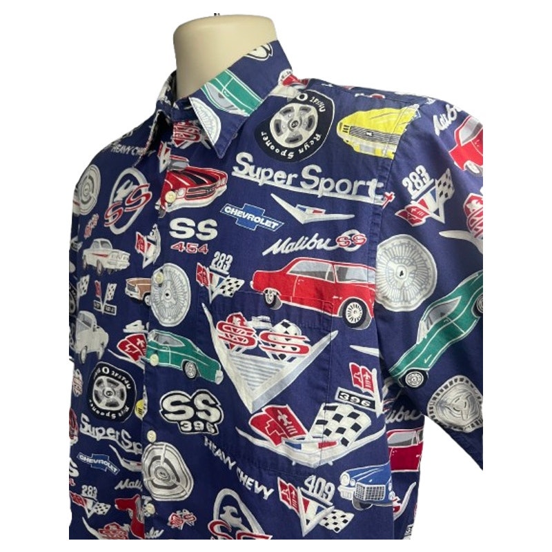 Reyn Spooner American Classics Chevy Cars Vintage Hawaiian Button Up Shirt Small Pocket All Over Print Lightweight Cotton Unisex. Made in Hawaii USA. Great Pre-Owned Vintage Condition Gently Worn. Ships from smoke free home.